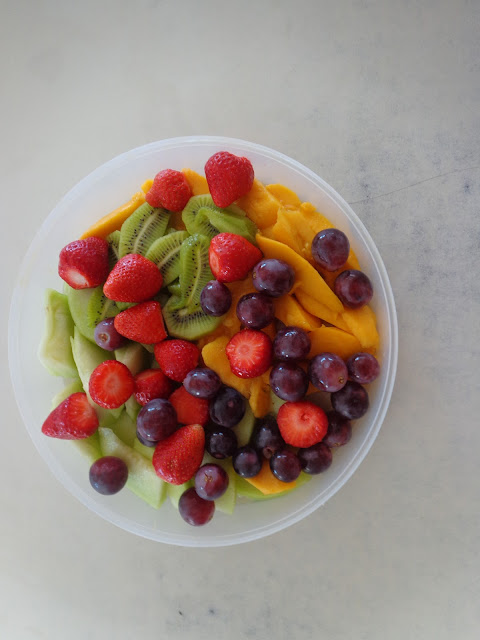 Observámos todas as frutas que haviam e comprámos cinco tipos de fruta