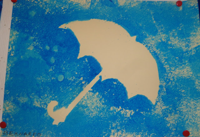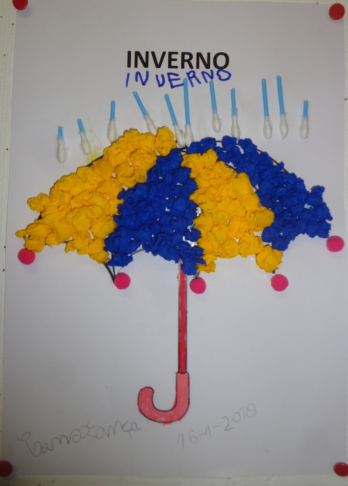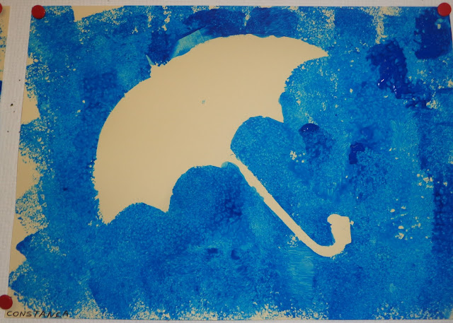 As crianças mais velhas fizeram pequenas bolas de papel crepe (desenvolver a motricidade fina) e decoraram o seu guarda chuva com duas cores (padrão)