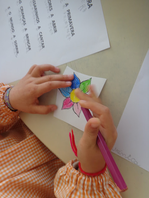 As crianças mais velhas copiaram um texto sobre a primavera (abordagem à escrita) depois tinham de escolher quatro flores diferentes para colorir (uma para casa e três para o trabalho). Por fim, recortar as flores e colar no trabalho de texto. (explorar o recorte)