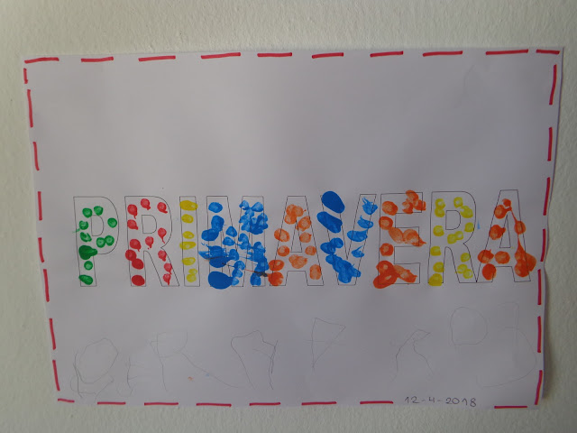 As crianças mais novas coloriram cada letra da palavra PRIMAVERA com uma cor diferente. Com o cotonete coloriram a letra sem sair dos limites da mesma (explorar o dentro/fora, contacto com as letras, conhecer as cores, explorar um técnica diferente)